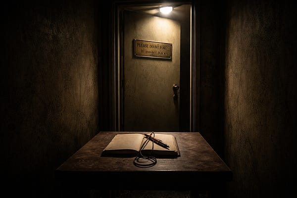 Are your words a mask or a bridge? This dark, precise tale of a door that "pushes back" is a merciless mirror for anyone who lives by—or behind—words.