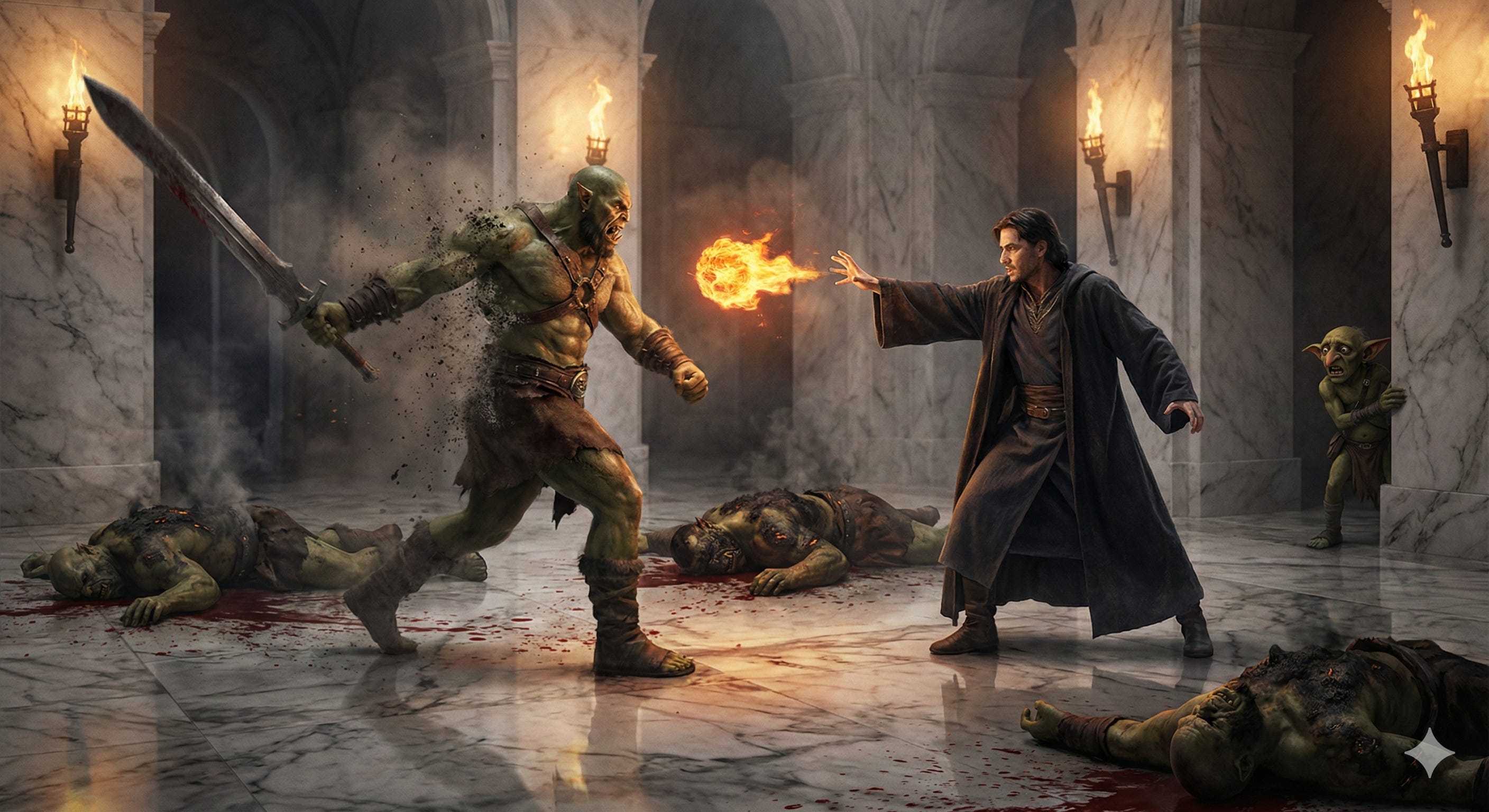 Rudd shuddered and crawled back out. He assured the waiting orcs that all was well and ushered them forward. They had barely entered the marble hall when they were hit by a giant fireball. Orc blood decorated the walls. The last orc charged with a giant sword, but after three withering spells, he crumbled to dust.