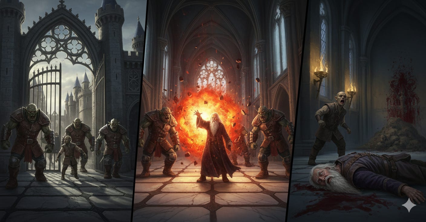 Rudd looked around the gore-stained hall. To ensure the wizard could not be resurrected, he performed a grim ritual, carving out the man’s heart—though in his haste and the dark, he mistook the heart for the tongue.