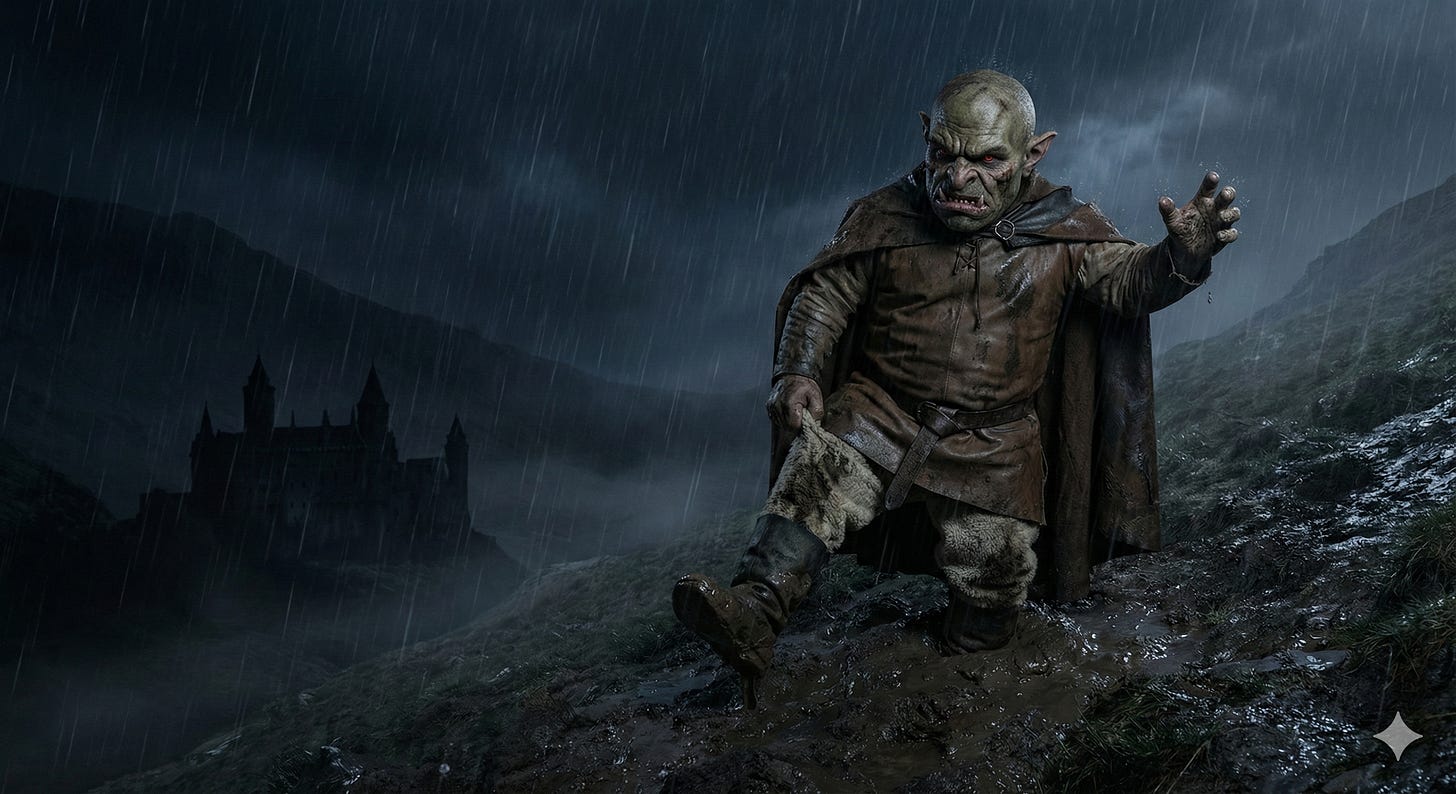 The four-foot-high orc looked at his left foot; it was stained with mud and wet to the bone. He was wearing a leather tunic and hose made of sheep hide. It didn’t look fancy, he admitted, but it kept him warm. His boots were also made of leather, and it stung him to think of losing one of them. He pulled his plain leather cloak tighter around him and shuddered.