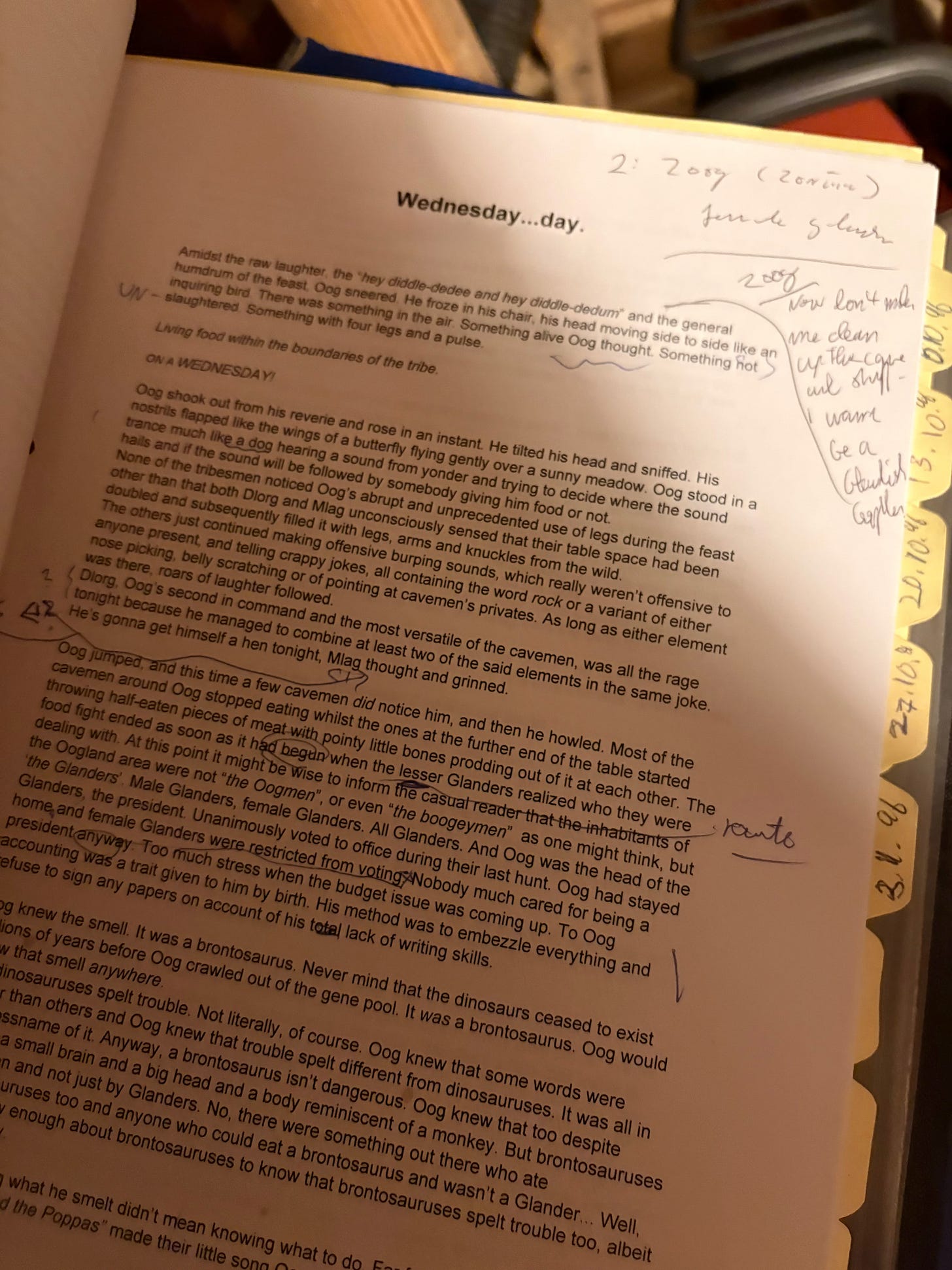 Amidst the raw laughter, the “hey diddle-dedee and hey diddle-dedum,” and the general humdrum of the feast, Oog sneered. He froze in his chair, his head cocked to the side like an inquiring bird. There was something in the air. Something alive. Something that wasn’t slaughtered. Something with four legs and a pulse.